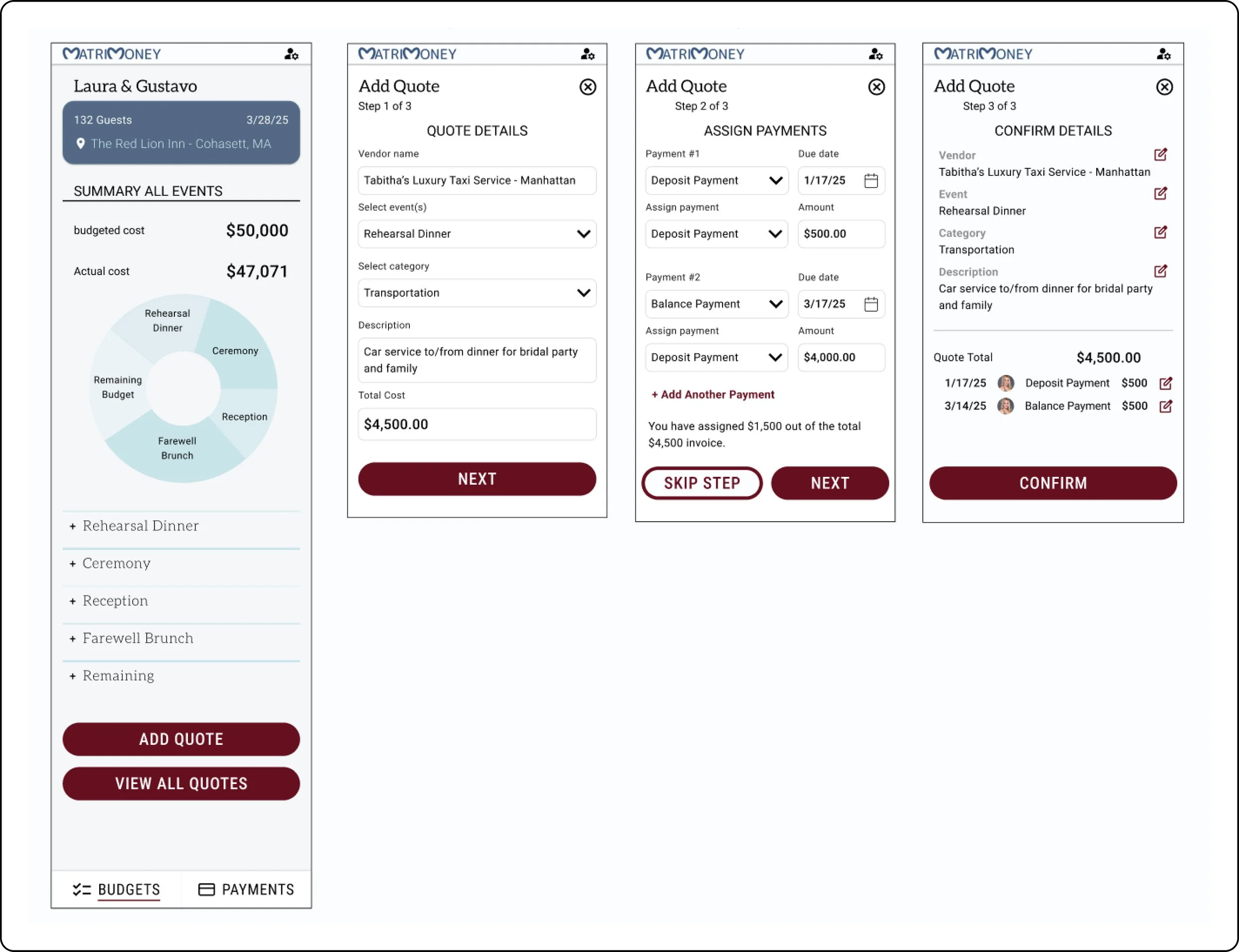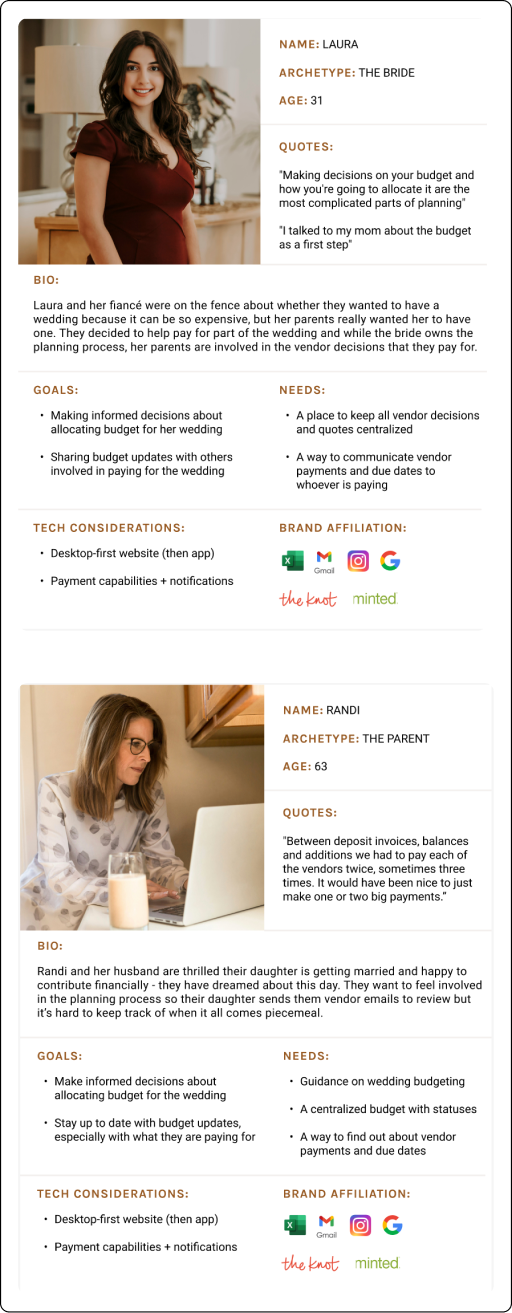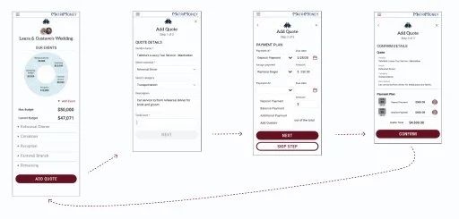 The result is a budgeting app specifically geared towards wedding events and including collaborative features to keep parents and involved parties up to date. Additional features for future launches will include payment capabilities and further vendor integrations, but the MVP focuses on 1. Budgeting and 2. Collaboration.